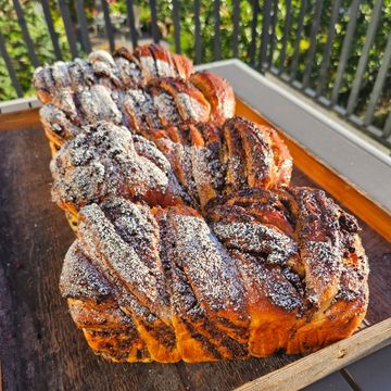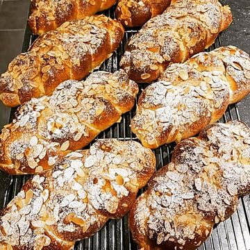 Rich and flavorful, with added golden and dark raisins. Topped with pearl sugar.